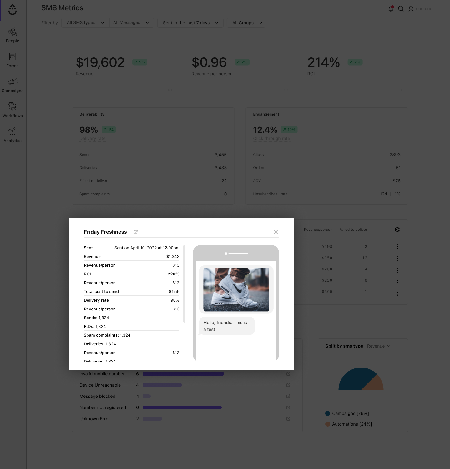 Added a “Split by SMS Type” chart for quick campaign-type comparison (Broadcast vs. Automation).